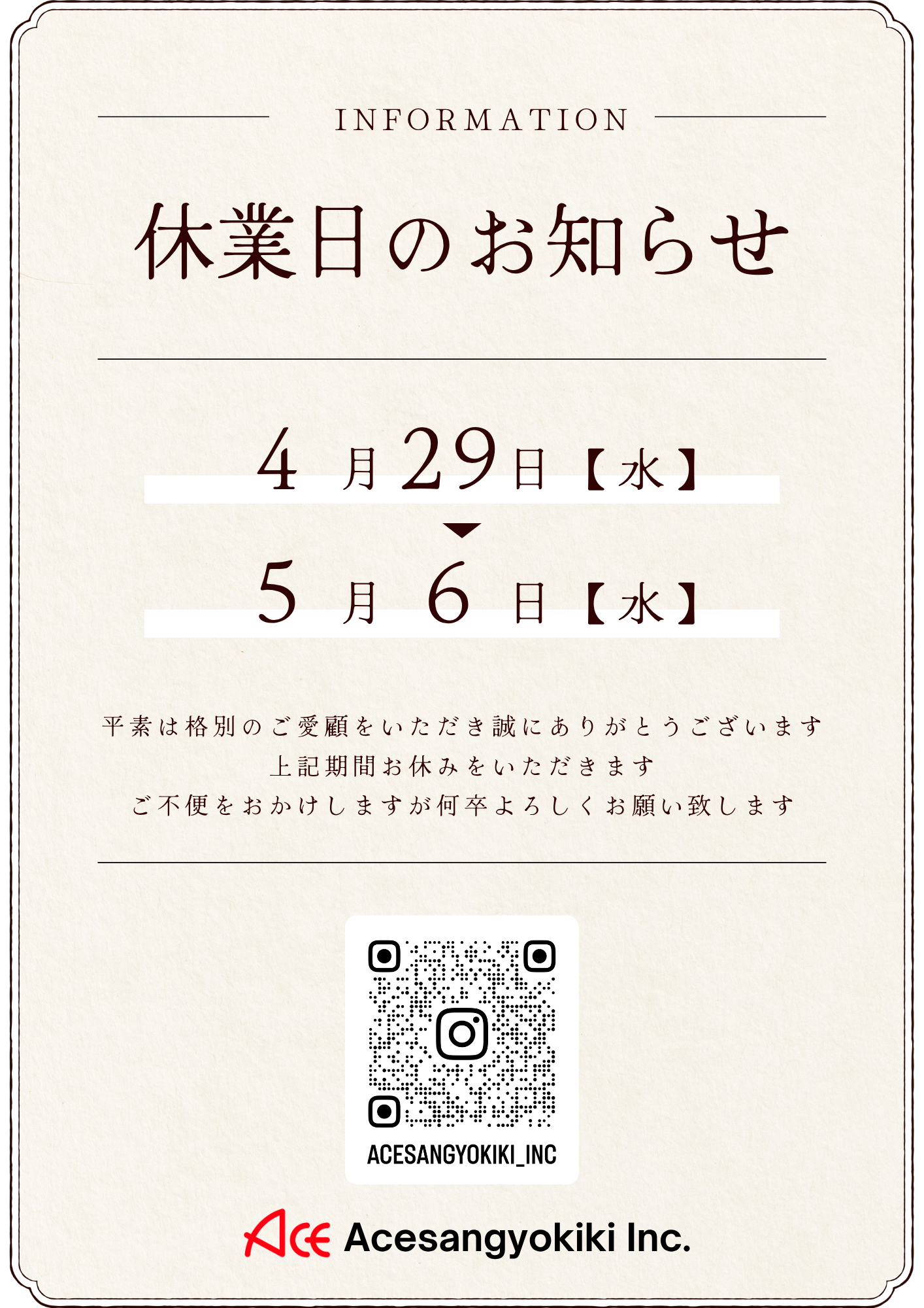 さて、誠に勝手ではございますが、下記の通り休業させて頂きます。
